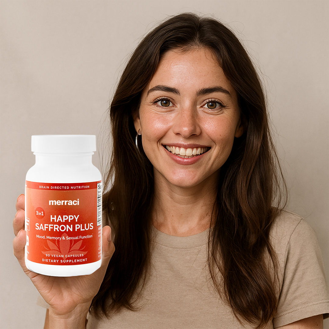 Happy Saffron Plus is a daily supplement designed to support a positive mood, improve memory and focus, and enhance sexual function — using clinically studied saffron extract, curcumin, and zinc.