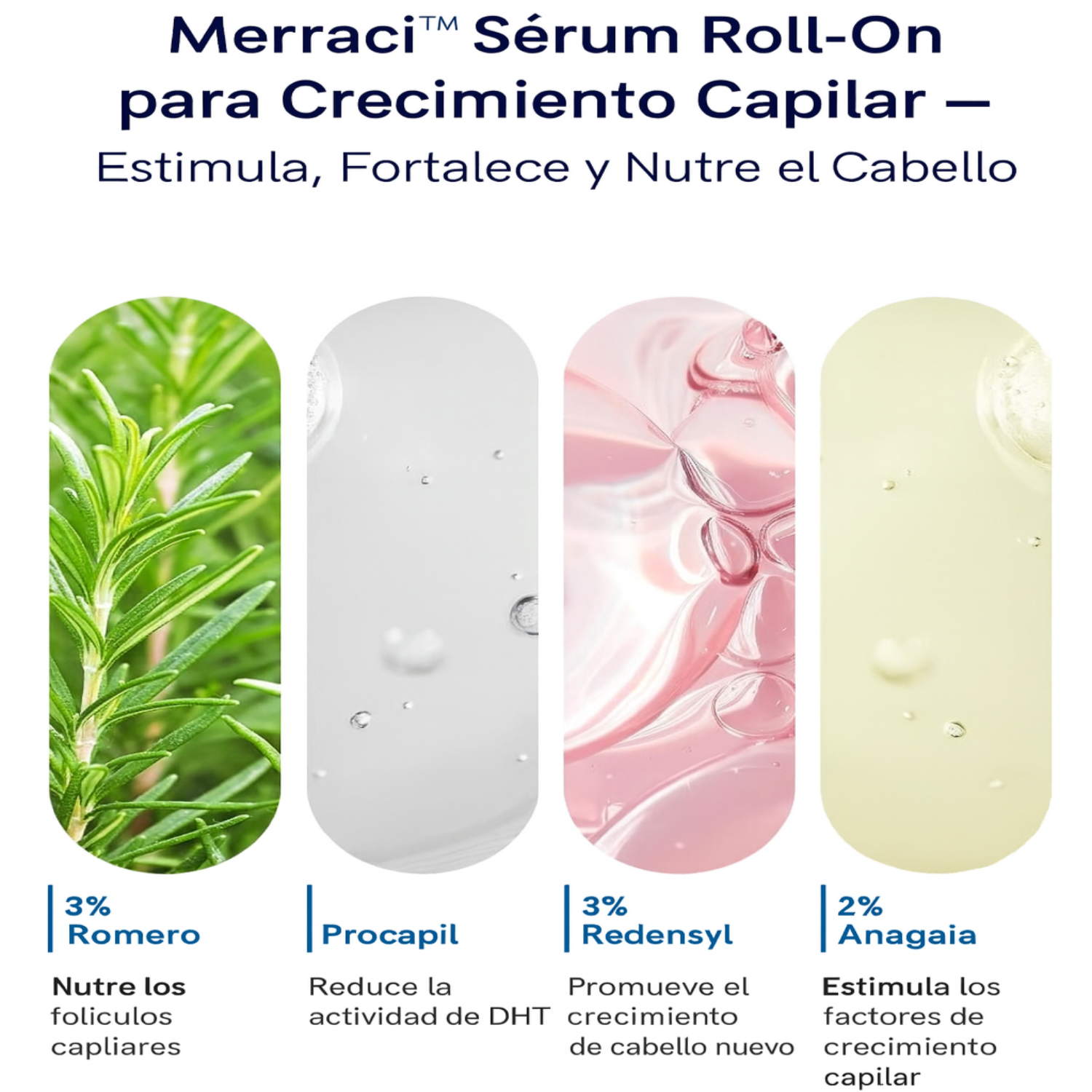 Luce un cabello increíble y siéntete segura con el Sérum Roll-On Merraci. Estimula el crecimiento, fortalece desde la raíz y aporta brillo natural en pocas semanas. Ideal para uso diario y todo tipo de cabello.